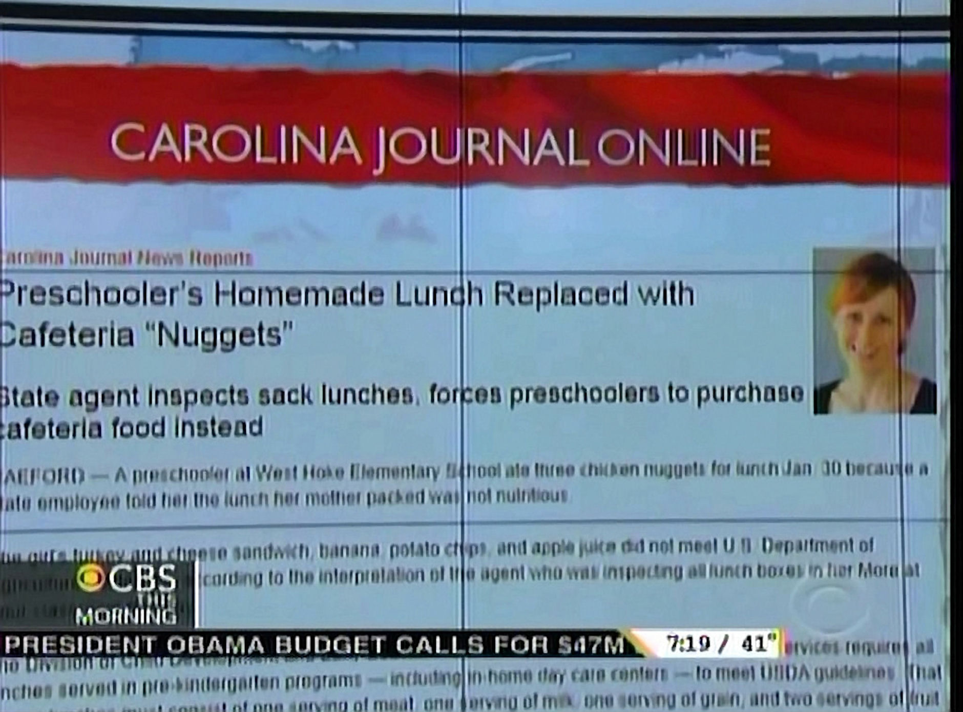 The young child had her meal replaced with, of all things, chicken nuggets. ABC's Good Morning America and NBC's Today often highlight amusing, weird stories in their broadcast. But only CBS This Morning found time, a mere 15 seconds. Erica Hill explained that the girl was "told to eat cafeteria chicken nuggets after a North Carolina state employee decided the lunch she brought to school was not nutritious."
