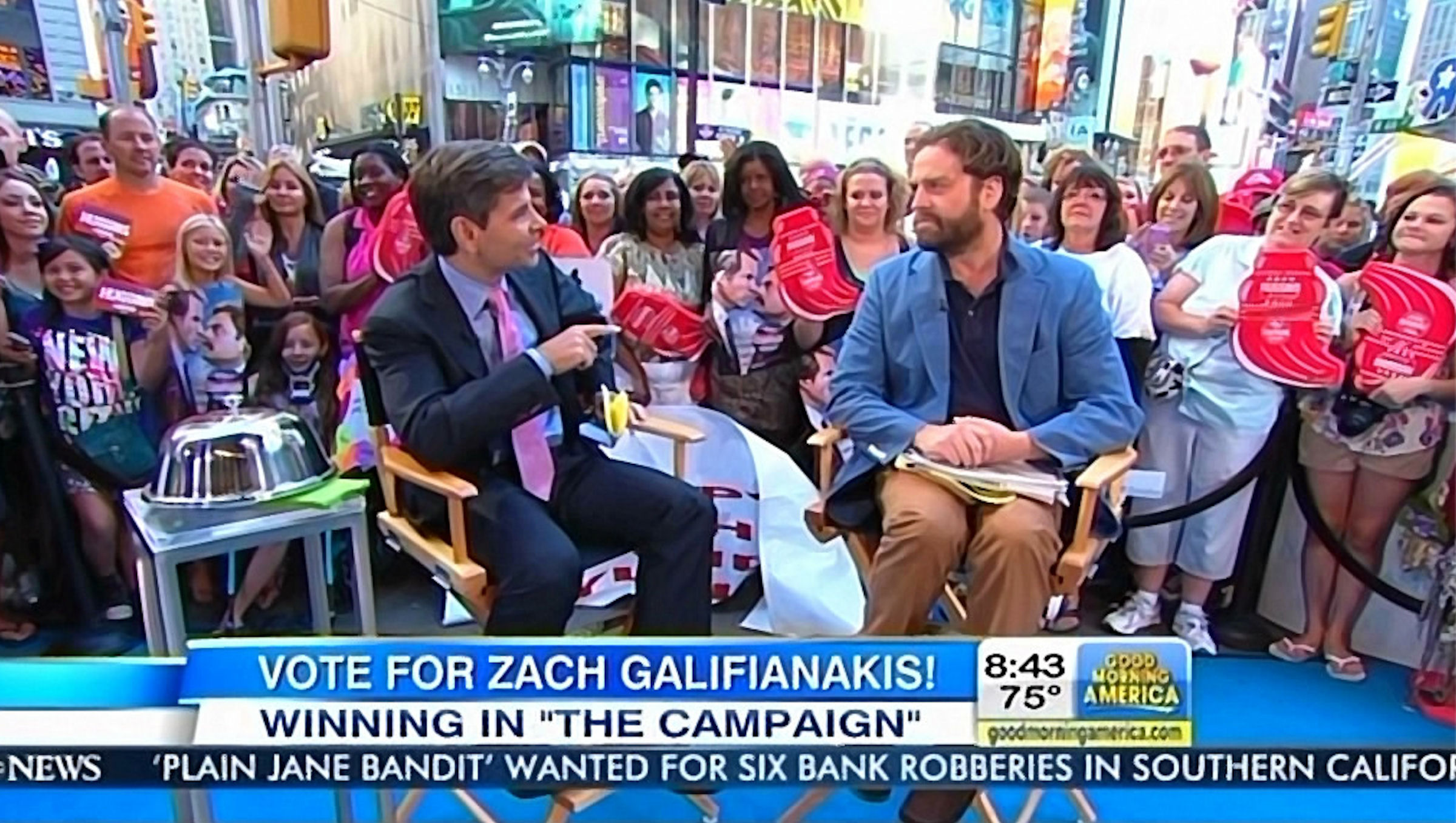 GALIFIANAKIS: I've been handing out money. Yeah. We were in Chicago and handed out- I had some extra money in my wallet and I just gave it to some people to try and win them over.