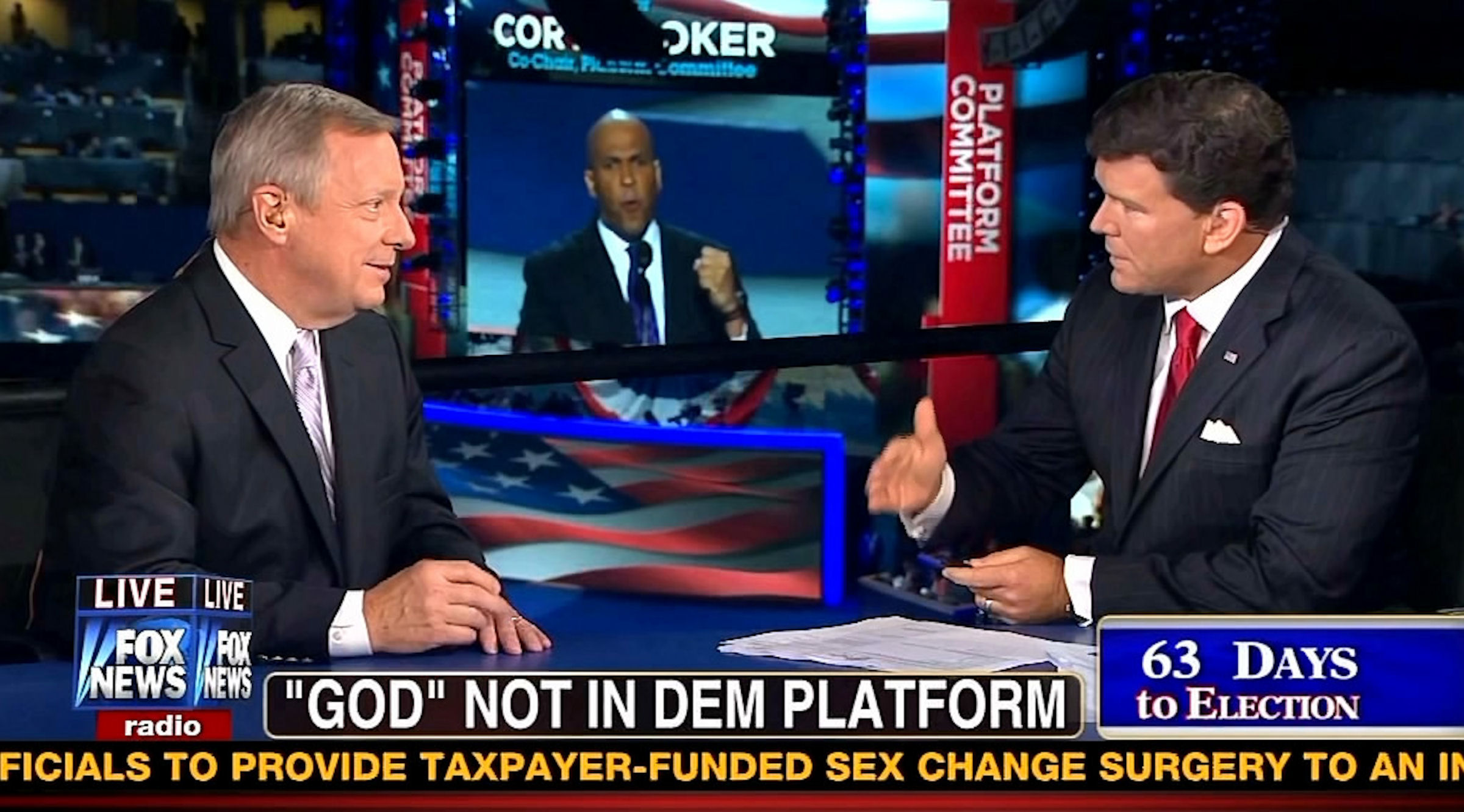 Some top Democrats appear touchy about the decision to avoid mentioning God. Senator Dick Durbin became visibly angry when Fox News anchor Bret Baier asked about it, Tuesday. Baier reminded, "In 2008, God was mentioned once. In 2004, it was mentioned seven times. In 2000, God was mentioned four times. Just a question. The question is why take it out in this time?" [See video of the heated exchange below. MP3 audio here.]