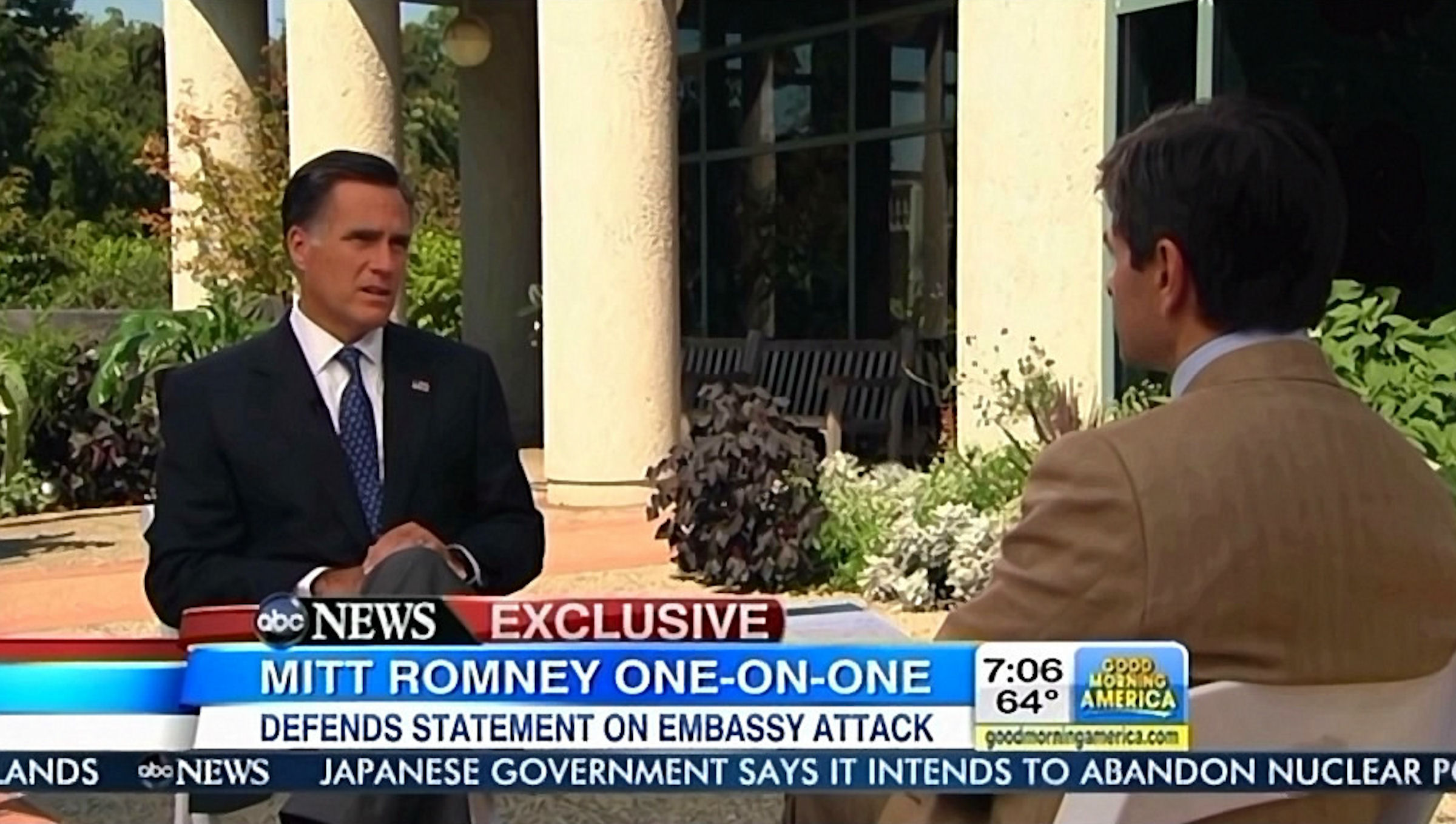 STEPHANOPOULOS: And in my interview with Mitt Romney, we cover a lot of other ground, including how he's preparing for those crucial debates with President Obama, what he thinks of new polls that have him falling behind and whether he regrets those first comments he made after this week's violence in Egypt and Libya. Romney accused the Obama administration of showing, quote, "sympathy for the protesters." The President said Romney was displaying a shoot-first-and-aim-later attitude and that's where we began.