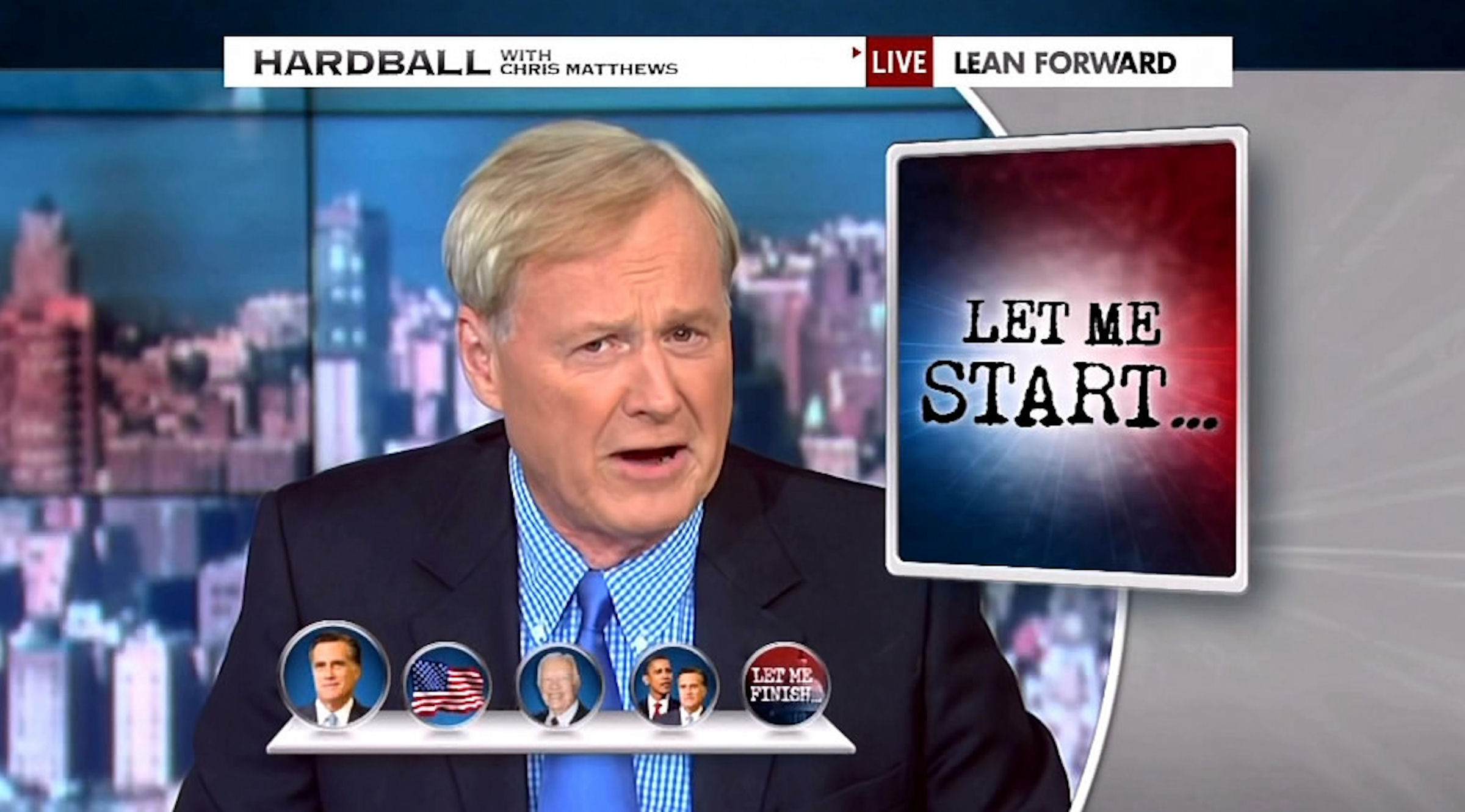 Matthews opened the program by announcing, "Let me start tonight" by singing a selection from Fiddler on the Roof. Highlighting a leaked video of Romney at a private fund-raiser, he then derided, "It's one thing to be rich and have the majority of voters convinced you're out to help the rich. Is there anything dumber to be caught pandering to your fellow rich?" Later, while talking to journalist Joe Klein, Matthews insulted potential GOP voters, comparing them to the racist TV character Archie Bunker.