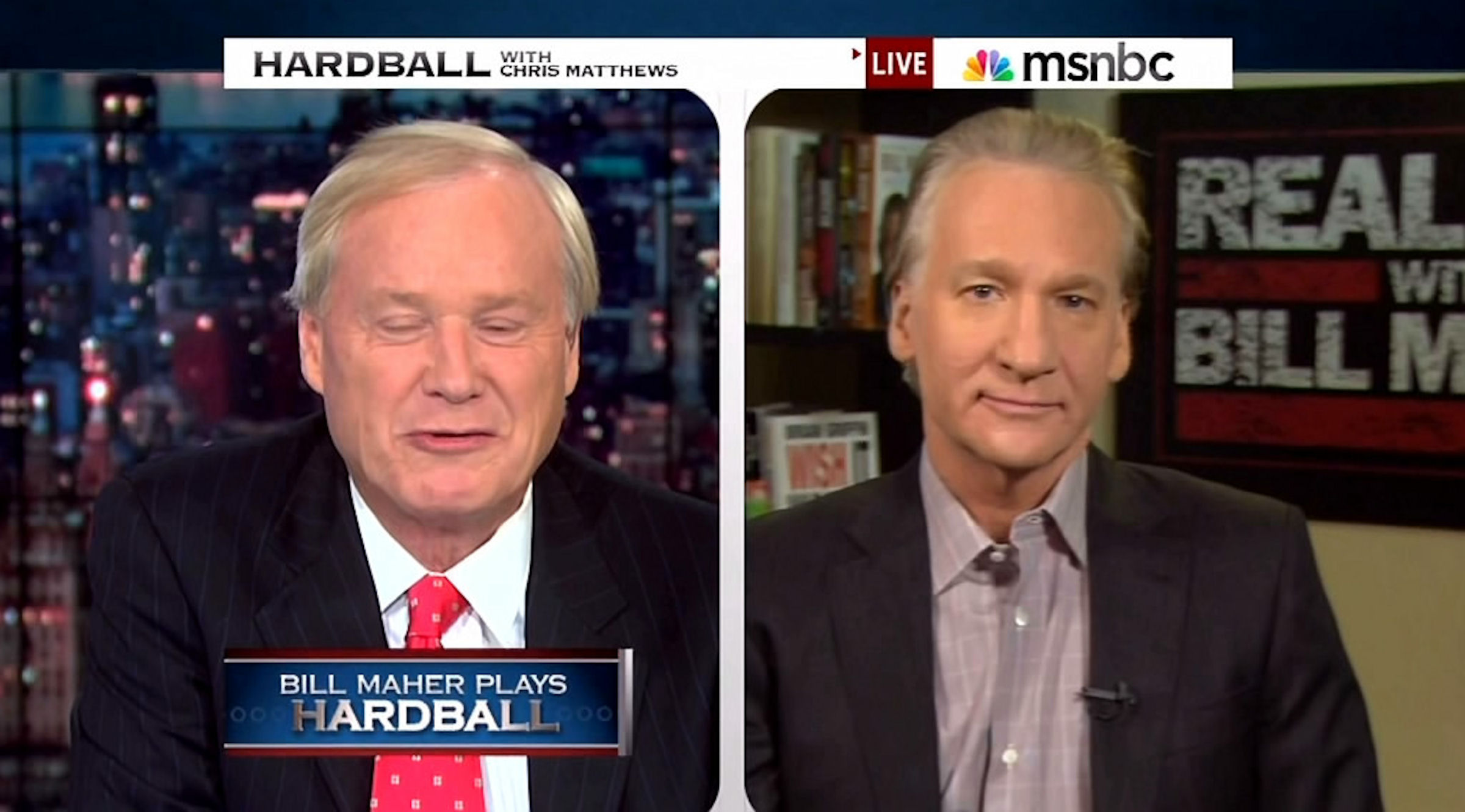 On the same night he apologized for making a horribly inappropriate comment about Hurricane Sandy, Chris Matthews on Wednesday had Bill Maher on Hardball to compare Karl Rove and Republicans to Nazis. After Matthews wondered about Rove's erroneous predictions, the liberal comic mocked, "It was a little Hitler's bunker, wasn't it? I wanted to rush in with a cyanide capsule there. I thought he was going to say, 'I don't want to live in a world without national socialism.'" [See video below. MP3 audio here.]