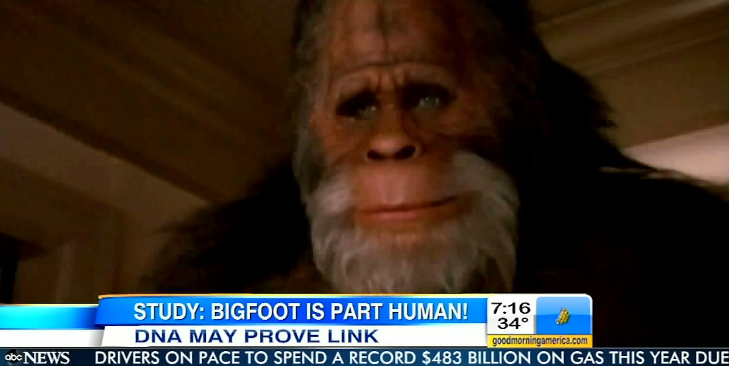 Guest co-host Amy Robach opened the show by enthusing, "Part-human, part-primate. Is Bigfoot real, after all?" Co-anchor George Stephanopoulos hyped "a prominent veterinarian who says she can prove Bigfoot exists and that he's related to all of us." Reporter Nick Watt could barely contain himself: "Oh my goodness, I want to believe. Can you imagine if Bigfoot is actually real?" Contributor Laura Spencer declared, "Yeah, I believe. I totally believe."