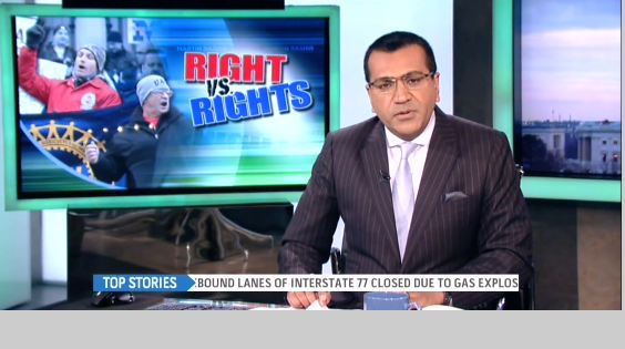 Although Bashir showed footage of some of the protests, he did not discuss the violence directed against political contributor Steven Crowder and others. Bashir only gently noted, "Angry protests have accompanied the decision by the state's legislature to send two bills, which would weaken unions, to the desk of the state's governor." After the liberal anchor played a clip of Governor Rick Snyder insisting the right-to-work legislation is "pro-worker," Bashir dismissed, "That's what we describe as a crap burger."