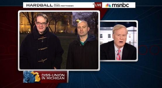 A calm Hagerstrom appeared on the show to discuss the just-passed right-to-work law in Mighican. He explained, "I work for Americans for Prosperity...This is about freedom for everybody." Matthews repeated over and over: "Who's paying your salary?...No, but who's paying your salary to do it? Who's paying your salary to do what you're doing right now?...Who's paying your– to do this today?"