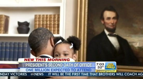 News reader Josh Elliott referred to the First Lady's new haircut as the "bangs that thrilled the nation...[Obama's] dear wife and the hair." Later, during live coverage, Weir talked to a 16-year-old in pajamas, visiting Washington for the inauguration. He wondered, "History is keeping you warm, right?" "Outstanding," enthused the journalist. World News anchor Diane Sawyer liked the line so much she repeated it later: "And I heard you say earlier, Bill, people are counting on history to keep them warm."