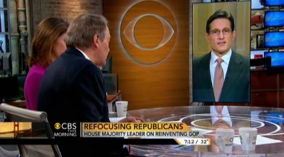 NORAH O'DONNELL: Meantime, House Majority leader Eric Cantor will be outlining a new agenda for his party today. He'll call on Republicans to focus more on issues like education and health care and spend less time talking about the deficit. Congressman Cantor, good morning.