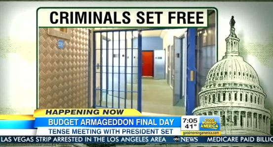 Reporter Jon Karl intoned, "The day is upon us. Those dreaded across-the-board spending cuts will go into effect sometime before 11:59 p.m tonight." He then touted White House talking points: "The administration warns that in the coming weeks, we'll see flight delays, kids thrown out off Head Start and criminals get free due to a lack of federal prosecutors."