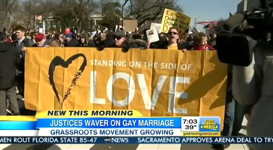 ABC's Good Morning America on Wednesday again offered the most biased coverage on the gay marriage case before the Supreme Court. All three network morning shows skipped specific mention of the multiple thousands who marched for traditional marriage on Tuesday. ABC, however, used loaded terms such as "marriage equality" rather than gay marriage. Reporter Terry Moran gushed over the liberal position: "This is a social movement, a 21st century social movement that arrived with astonishing speed at this court, driven by activists, by Hollywood in part and by young people, especially on social media." [See video below. MP3 audio here.]