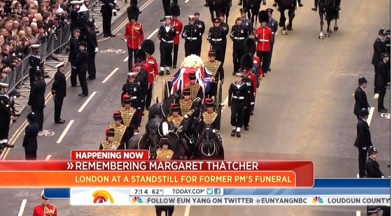 On the April 17 Today, Keir Simmons reported live from the funeral route and deemed Thatcher a "divisive figure for many people in Britain." He did allow that there were "many people here in the streets to pay their last respects."