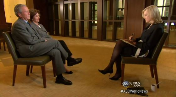 DIANE SAWYER: Back here in Dallas, we're at the George W. Bush library and he and Mrs. Bush are going to weigh in on the news and their lives in private as the library is about to open. He has been off stage, away from reporters, in silence. But tonight he sits with Mrs. Bush as we ask him from everything from terrorism to the next election. Mr. President, great to be interviewing you again. Did you miss all of us?