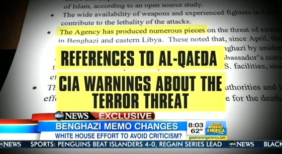 PAULA FARIS: And an ABC News exclusive this morning about the White House spin after the terror attack in Benghazi, Libya. Documents show the State Department requested changes to a CIA memo, deleting all references to previous warnings about al Qaeda and the terrorism threat there. The changes appear to been made to avoid criticism for ignoring those warnings.