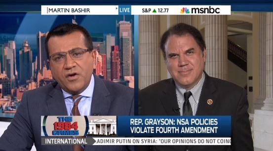 ALAN GRAYSON [on NSA director Keith Alexander]: The NSA is keeping a record of every single telephone call that you make, every single phone call that I make, every single phone call that every American makes. What he failed to show that kind of, basically, Big-Brother-is-watching-you" type surveillance is necessary or even that it helped in any of those situations that he described. Similarly, with regard to the PRISM program, the document that was released in the leak indicates that there are e-mails that are being transcribed VOIP, which is the content of telephone calls. There are pictures being downloaded from apple, from Google, from Microsoft and this has been going on now for seven years. No, I'm sorry. To say that they've done their job reasonably well overall and prevented terrorist attacks does not mean they have to induce this level of intrusion to keep us safe. It's a disconnect.