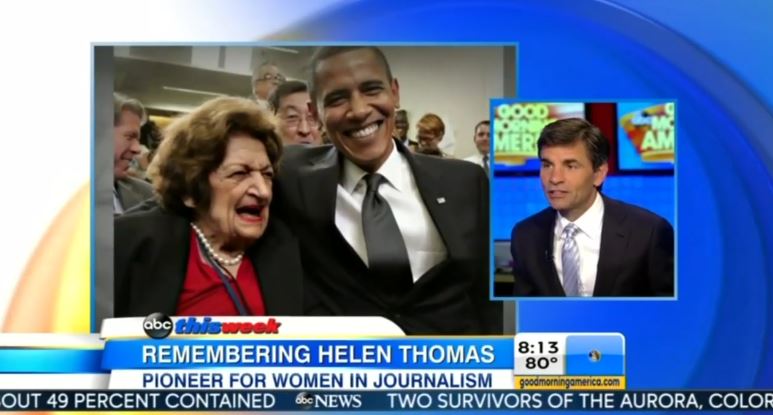 Appearing on Sunday's Good Morning America, Stephanopoulos remembered, "She was so tenacious, so passionate. She was such a trail blazer and mentor to a lot of women reporters in that White House briefing room as well and everybody could count on her to ask the tough questions." Regarding Thomas's venomous, anti-Israel rant in 2010, the host conceded, "...At the end of her career, she did, in some ways, let her biases loose a little bit, had to apologize for that later." [See video below. MP3 audio here.]