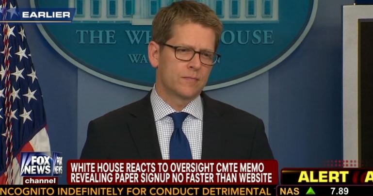A frustrated Jay Carney on Monday excoriated ABC's Jon Karl for exposing the fact that signing up for health care via phone or mail is just as difficult as signing up by the website. Karl began by quoting the President suggesting in late October that "you can bypass the website and apply by phone or in person." The journalist highlighted newly acquired memos admitting that "at the end of the day, we're all stuck in the same queue because all those applications have to go through the same website."
