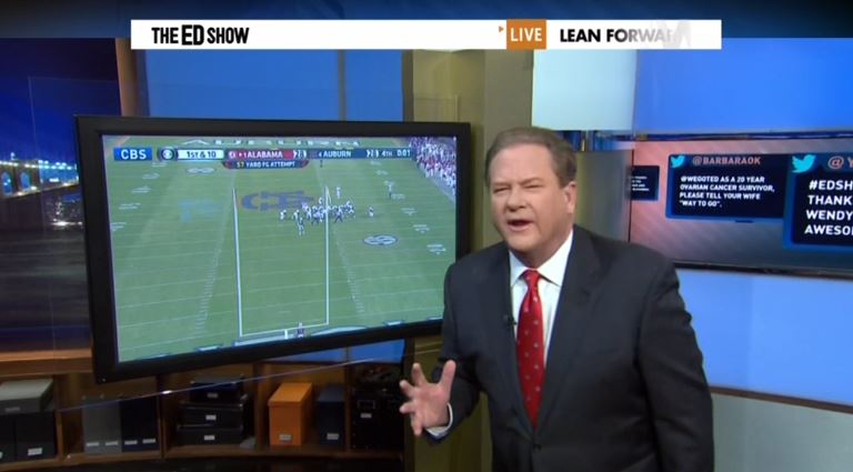Perhaps the White House told Ed Schultz to compare the administration to a powerhouse football team? On Monday's MSNBC program, the liberal host offered a tortured analogy: Barack Obama is just like the University of Auburn's football team and the Republicans are the defeated Alabama. Schultz even replayed Saturday's exciting final play, swapping out player Chris Davis for the President: "Holy smokes, we've got a return by ObamaCare! This is Chris Davis. He's a believer! He's got all those Obama blockers out there!" [See video below. MP3 audio here.]