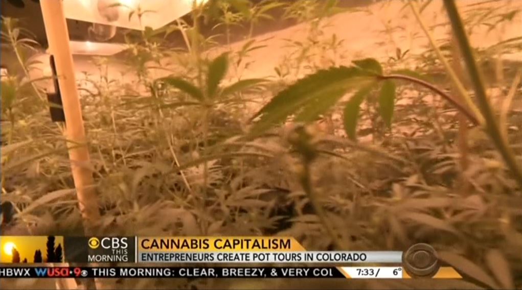 Petersen narrated, "Call it cannabis capitalism, the latest leaf to sprout from legalized marijuana. Michael Eymer's pot tours costs $240 bucks a person." The journalist offered a promotional look at the new industry: "Eymer has bookings and belief that he's in on one of Colorado's new growth industries. If I want to take the tour, how long am I going to have to wait to get aboard?"