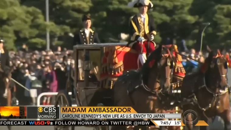 Explaining the start of Kennedy's ambassadorship, Doane cited the "ceremonial aspect," narrating, "That was showcased when she was brought by horse-drawn carriage to present her credentials to the emperor. Thousands lined Tokyo's streets in November to catch a glimpse of this fairy tale-like scene." [See video below. MP3 audio here.]