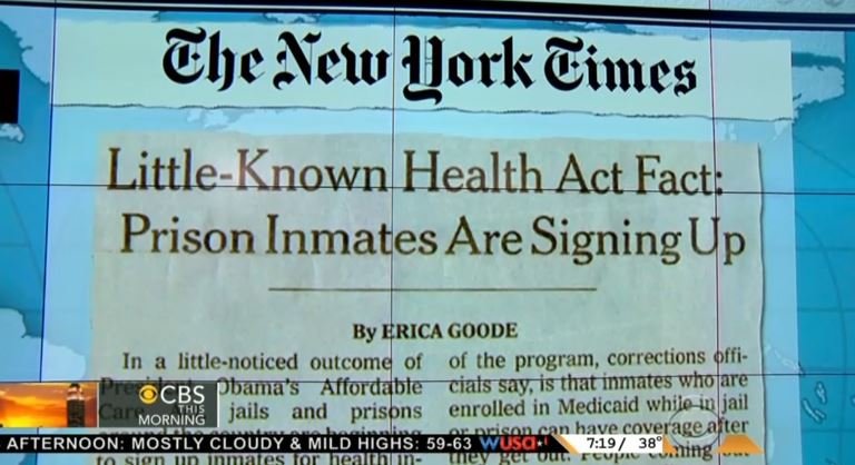 If you like your jail cell plan, you can keep it? In a front page story for Monday's New York Times, writer Erica Goode revealed that prisons all across the country are enrolling inmates to ObamaCare. Despite the fact that many media outlets consider the Times to be the "paper of record," NBC and ABC ignored the news that taxpayer-funded money would be going to the health care of convicted criminals.
