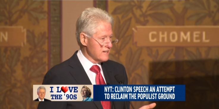 Although the story included a quote from Ralph Nader attacking Hillary Clinton, the piece mostly relied on old allies of the former president to defend the power couple. Chozick helpfully lectured, "Voters generally have a rosy view of the 1990s." The journalist informed, "The speech reflected a strategic effort by Mr. Clinton and his advisers to reclaim the populist ground now occupied by Senator Elizabeth Warren of Massachusetts and other ascendant left-leaning Democrats..."