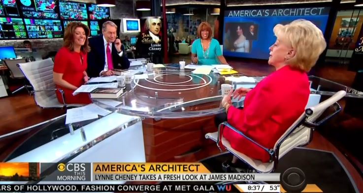 The hosts of CBS This Morning on Tuesday featured Lynne Cheney to talk about her new book on James Madison. However, predictably, the topics drifted towards a grilling on gay marriage and her daughters' public spat over the subject. Additionally, Norah O'Donnell rather obviously quizzed Cheney on whether being a Secretary of State, like Madison, would still be a good path for the president in 2016.
