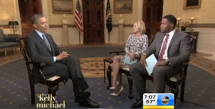 To be sure, the interview contained plenty of softballs. Strahan wondered, "Do you get more white hair from what you do here as president or dealing with teenage daughters?" Co-host Kelly Ripa gushed, "Who would you better on Dancing With the Stars? You or Mrs. Obama?"