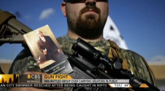 NORAH O'DONNELL: And the Houston Chronicle says the National Rifle Association is criticizing some of its usual supporters. NRA lobbyists say it's, quote, "scary and downright weird" that Texans are bringing rifles and shotguns into restaurants. Manuel Bojorquez is in Irving Texas, outside We're Dallas where activists say they not going to back down even if the NRA tells them to.