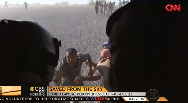 DAVID MARTIN: Iraqi Army helicopters fly in at 100 feet in broad daylight to push pallets of food and water out the door. When one found a piece of ground level enough to land on, it was immediately rushed by men, women and children, desperate to escape the Sinjar Mountains. While the crew pushed the last boxes of aid out the door, children were nearly crushed in the melee to get aboard. The helicopter could only hold 25 passengers and there were hundreds fighting for those spaces. For the lucky ones that made it, the ordeal was not yet over. The helicopter came under fire from ISIS fighters on the ground. It was one more terror to be endured by people who had already been driven from their homes and who almost certainly had left family members behind on the mountain, not knowing when the next chance for rescue might come. For CBS This Morning, David Martin at the Pentagon.