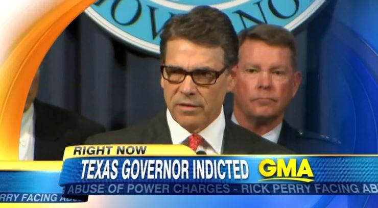 Offering a familar line, Dan Harris began the August 16 Good Morning America by announcing, "Potential presidential contender indicted overnight -- Rick Perry, the governor of Texas, accused of abusing his power in office."