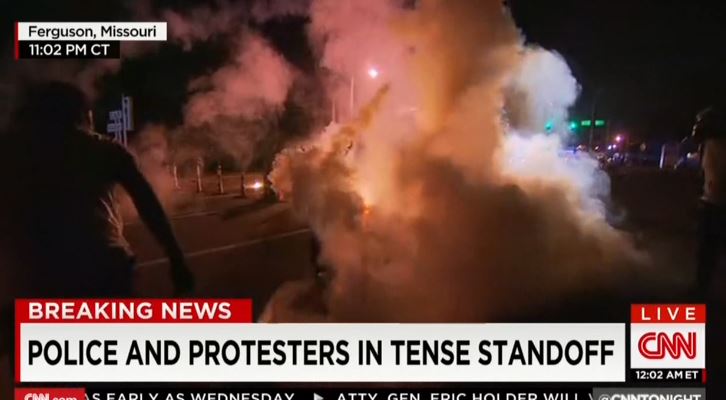 CNN anchor Jake Tapper was on the ground Monday night in Ferguson, Missouri as stun grenades and tear gas exploded around him. The journalist had been covering the standoff between protesters and police when the situation became chaotic. [See video below. MP3 audio here.]
