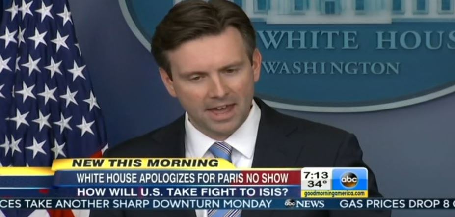 White House press secretary Josh Earnest on Monday admitted, "I think it's fair to say that we should have sent someone with a higher profile to [the Paris rally]." On GMA, George Stephanopoulos trumpeted this as an "unusually rapid concession for the White House." Jon Karl deemed it "a remarkably quick turnaround for a White House that rarely admits mistakes."