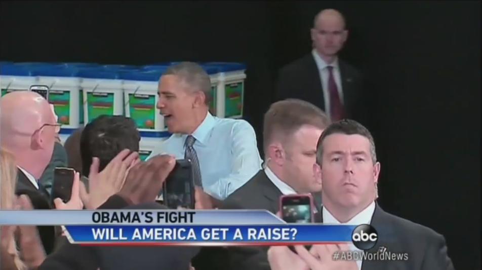 Following the State of the Union speech, the networks hyped Obama’s campaign-style events where he promoted executive action on minimum wage for federal contractors. On Jan. 29, “World News,” ABC’s Jonathan Karl repeated Obama’s own rhetoric, saying he “was out there hitting that ‘give America a raise’ theme hard today.”