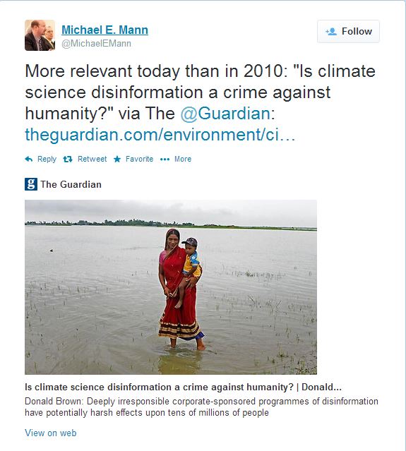 On May 20, Michael Mann, a climatologist who is often interviewed by media outlets to warn about the threat of global warming, tweeted a 2010 article from The Guardian (UK) that asked “Is climate science disinformation a crime against humanity?” He called that question “more relevant today than in 2010.”
