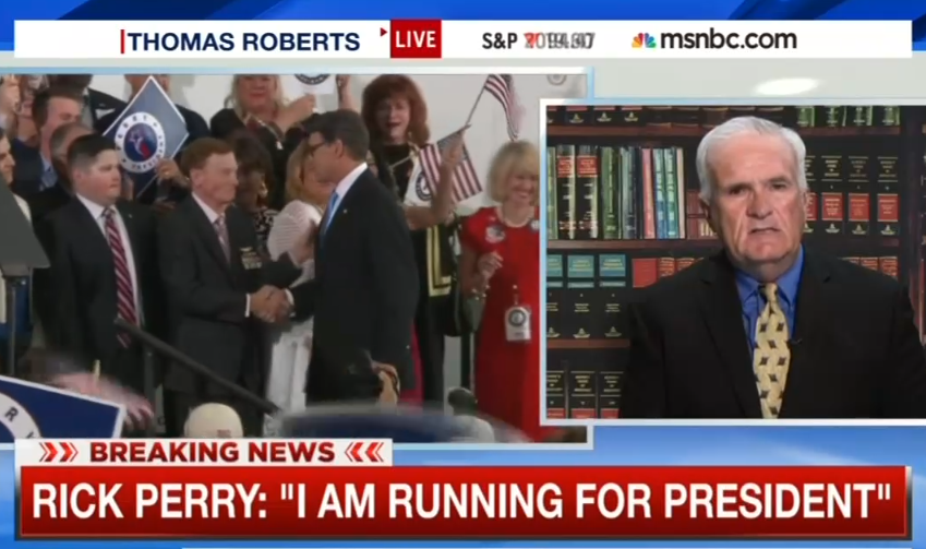 Shortly after former Texas Governor Rick Perry announced his bid for the Republican nomination yesterday, less-than-objective MSNBC sought out the author of an anti-Perry, anti-Texas book to discuss the highlights of the Texas hopeful’s speech. MSNBC Live host Thomas Roberts and James Moore, an analyst for the network and author of Adios Mofo: Why Rick Perry Will Make America Miss George W Bush, seem to agree 2015's newest presidential candidate is mired in “big negatives.”