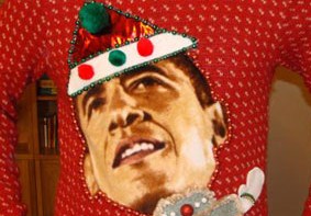 On the north side of the tree--at a height of about 4 feet and easily visible to people standing near it---there is an ornament that says: “I ♥ President Obama.”