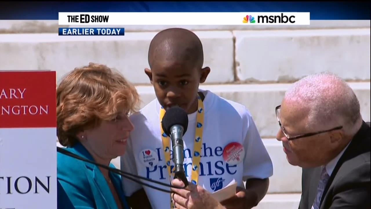 Liberals usually get upset when politicians suggest someone is on a mission from God when they have a political program to push – at least when it’s a conservative program. During Saturday’s live MSNBC coverage of the March on Washington anniversary (organized by Al Shaprton), Ed Schultz proclaimed that 9-year-old Asean Johnson, speaking out (well, reading a sheet of paper) on behalf of a teacher’s union, was “a gift from God” in fighting against “under-resourced” public schools.