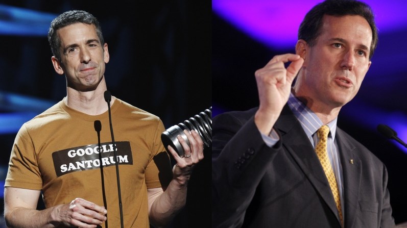SAVAGE. Rick Santorum… or the popes. Can’t pick. Can I have Rick Santorum read it to the popes? As for why … well, because I’m an a–hole, I guess. That’s why.