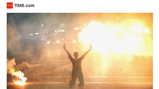 Time is offering the usual benefits in the media's unofficial Rewards for Rioters program. Burning businesses to the ground is merely "unrest" -- or a dramatic flaming background for "civil rights" silhouettes. Robbing a store and then charging for a policeman's gun is reduced to an "unarmed black man," with the usual implication he was an innocent minding his own business.