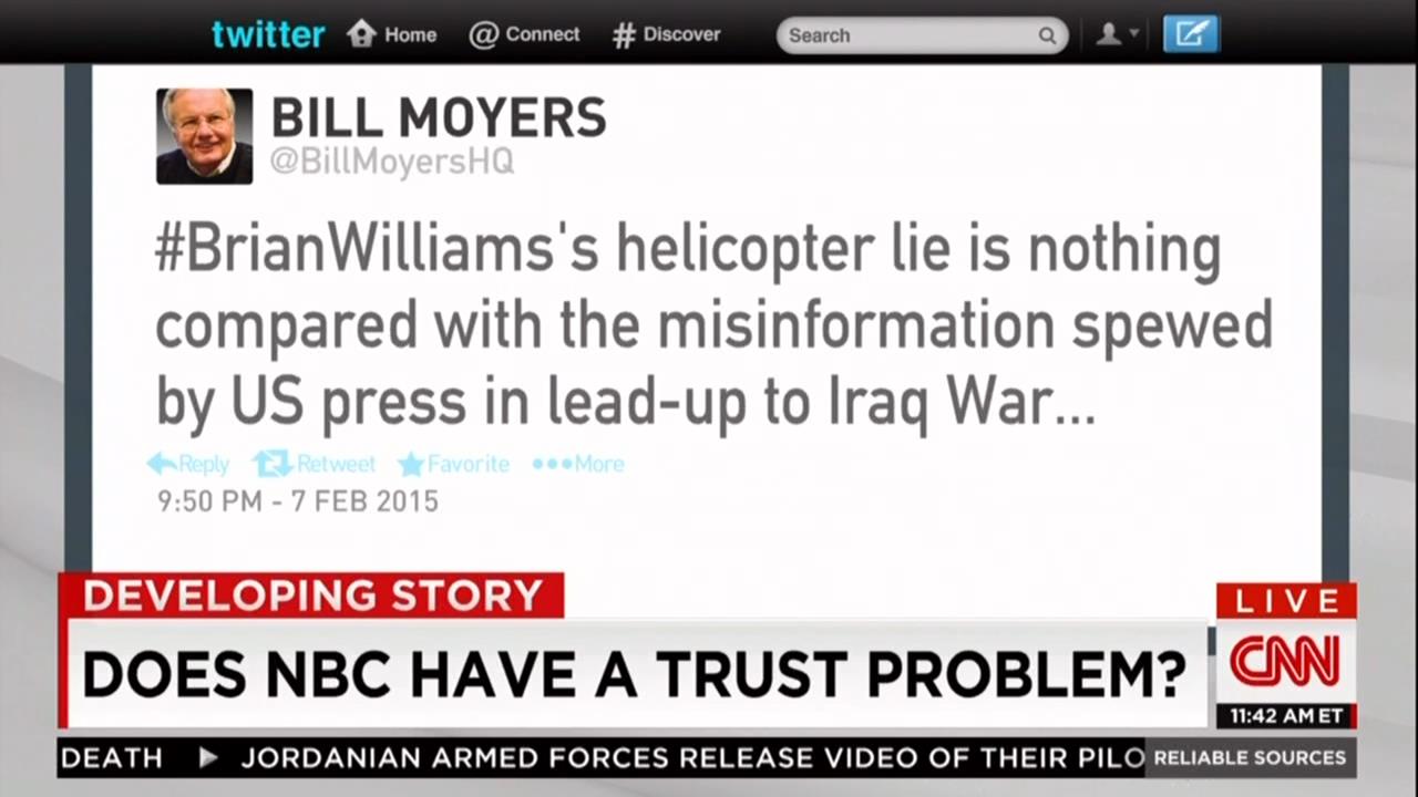 STELTER: Jeff, let me put a tweet on screen from Bill Moyers. He's linking to a colleague of his, what he wrote online yesterday. It says: "Brian Williams's helicopter lie is nothing compared to the misinformation spewed by U.S. press in lead-up to Iraq War."