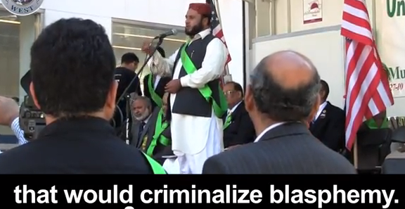 (Identified as "a Brooklyn imam") The freedom of speech and freedom of rights our problem starts. So I would like to demand United Nations to make an international law that would criminalize blasphemy. I again demand to the United Nations and to this platform, please make an international law, for the protection of honor of our beloved prophet.