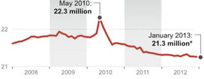 In attempting to make the case that "Even as the private sector has been slowly adding jobs, governments have been shedding them," a chart from the Associated Press, aka the Administration's Press, shows how public-sector employment (not labeled as "seasonally adjusted," but that's what it is) has declined from a peak of 22.3 million in May of 2010 to 21.3 million in January 2013.