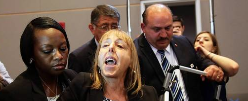 Code Pink's Media Benjamin managed to break into another presidential event on Thursday, namely Barack Obama's speech at the National Defense University. The topic was "U.S. Counterterrorism Strategy," meaning that the administration's aversion to the T-word seems to be diminishing as the damaging scandal-related news continues to pour in.