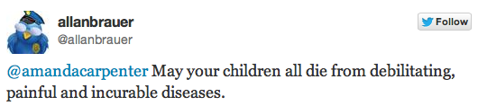 On Friday, Allan Brauer, the Sacramento County Democratic Party's communications director directed the following tweet (HT Twitchy) at Amanda Carpenter, a speechwriter for Texas Senator Ted Cruz: "May your children all die from debilitating, painful and incurable diseases."