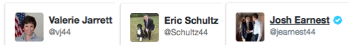 The tweets come from Senior Advisor to the President Valerie Jarrett, White House Deputy Press Secretary Eric Schultz, Special Assistant to the President Josh Earnest (HTs to Twitchy here, here, and here):