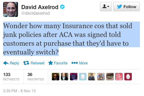 Assisting the Obama administration in its perpetual flight from responsibility for anything, former Obama campaign manager David Axelrod, who now campaigns from a paid propaganda perch at NBC and MSNBC, tweeted the following on Friday afternoon (HT Twitchy): "Wonder how many Insurance cos that sold junk policies after ACA was signed told customers at purchase that they'd have to eventually switch?"