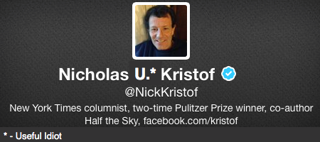 Nicholas D. Kristof (I've tended to call him "Nick" through the years) has made and implemented a momentous, course of civilization-altering decision effective 1/1/2014 (HT Twitchy): "If you look closely at my Times byline ... I’ve knocked out my middle initial for the new year."