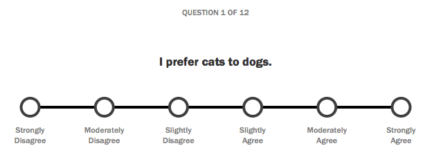 First, each agree/disagree question forces you to at least slightly agree or disagree, i.e., there is no "I don't care" equivalent). The fact is that many people, to name just one example, don't have a preference between cats and dogs, but are forced to indicate one if they answer the question.
