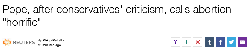 A few hours ago, the folks at Twitchy.com caught the following headline at Reuters at a story about Pope Francis: "Pope, in nod to conservatives, calls abortion 'horrific.'" At roughly 11:45 Eastern Time, the headline at Philip Pullella's story carried at Yahoo News ventured even further into the unreal: "Pope, after conservatives' criticism, calls abortion "horrific.'"
