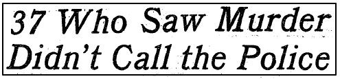 ... The tabloids had treated it simply as a sensational tale of urban violence. The Times made sure that its apathetic-witness angle would land by prominently displaying the story on its front page. The murder now stood for a profoundly disturbing sociological trend. The key line in Gansberg’s story came from one of the witnesses (none of whom were named), who said, “I didn’t want to get involved.”