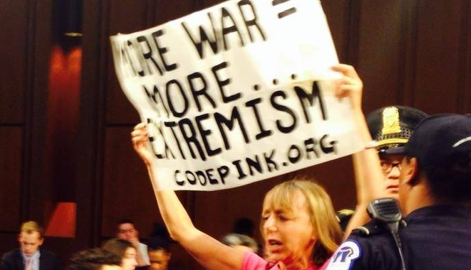 Ms. Benjamin and Code Pink did not make the front page of today's Washington Post, in words or pictures. Craig Whitlock's lengthy coverage of the hearing does not mention its brief disruption.